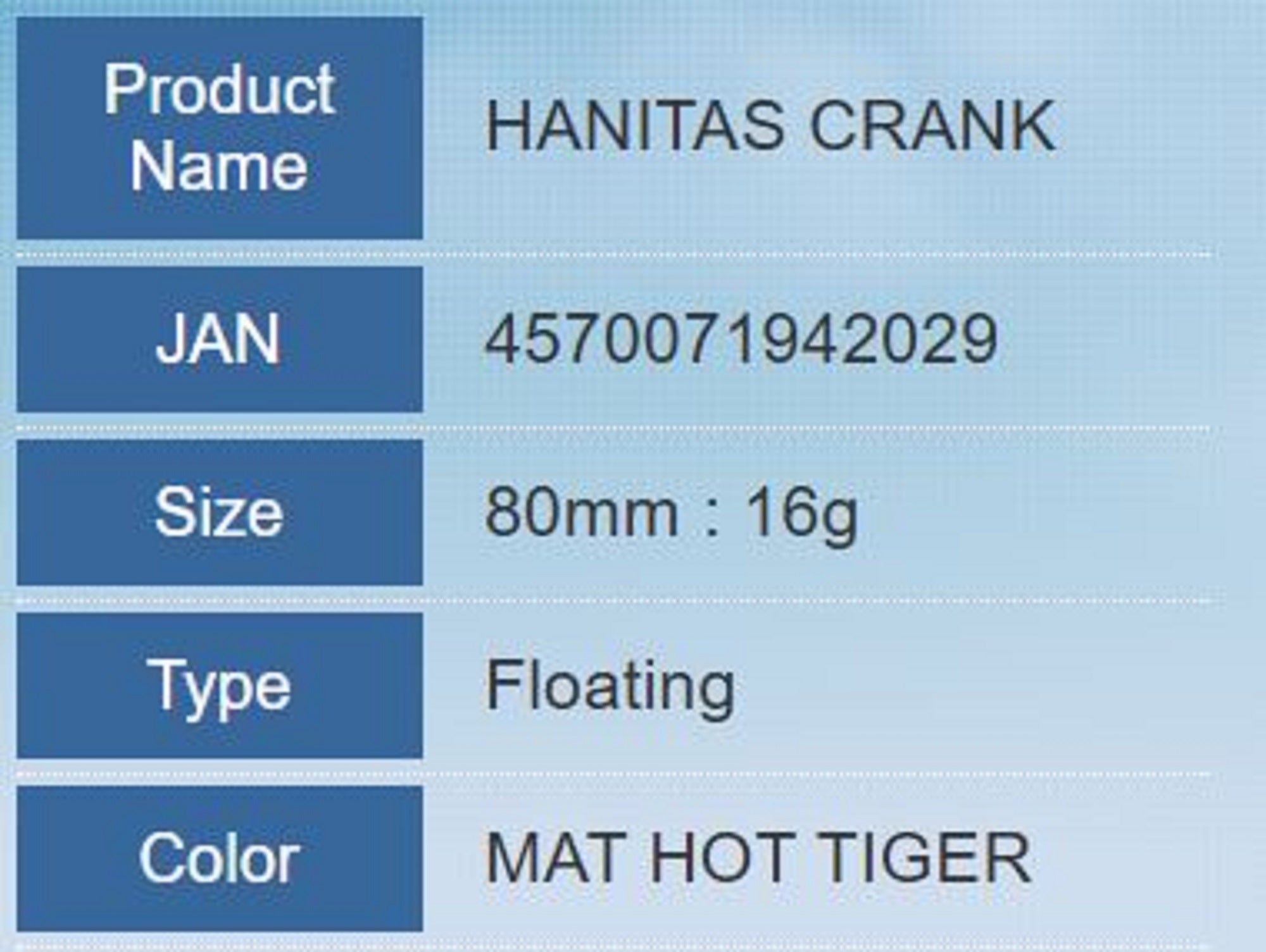 Madotachi Hanitas Crank 80mm 16 gram Floating Lure Matt Chart (2012)