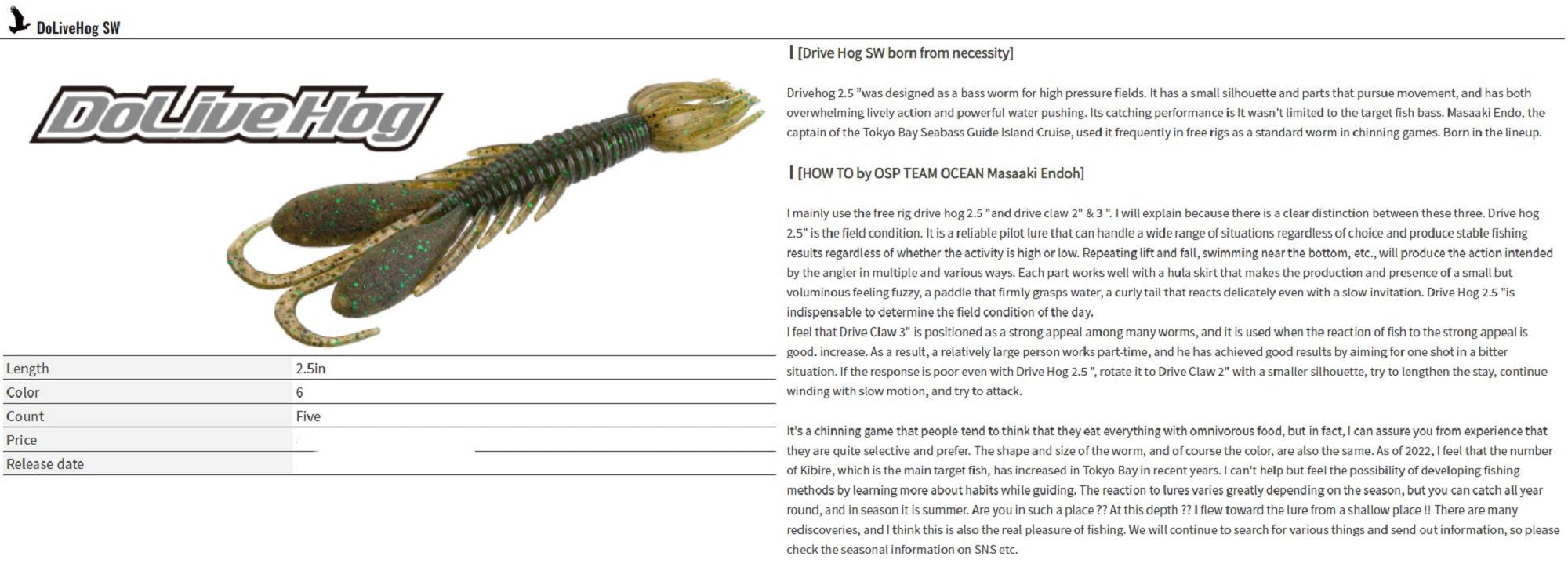 OSP Soft Lure Dolive Hog SW 2.5 Inches W070 (0149)