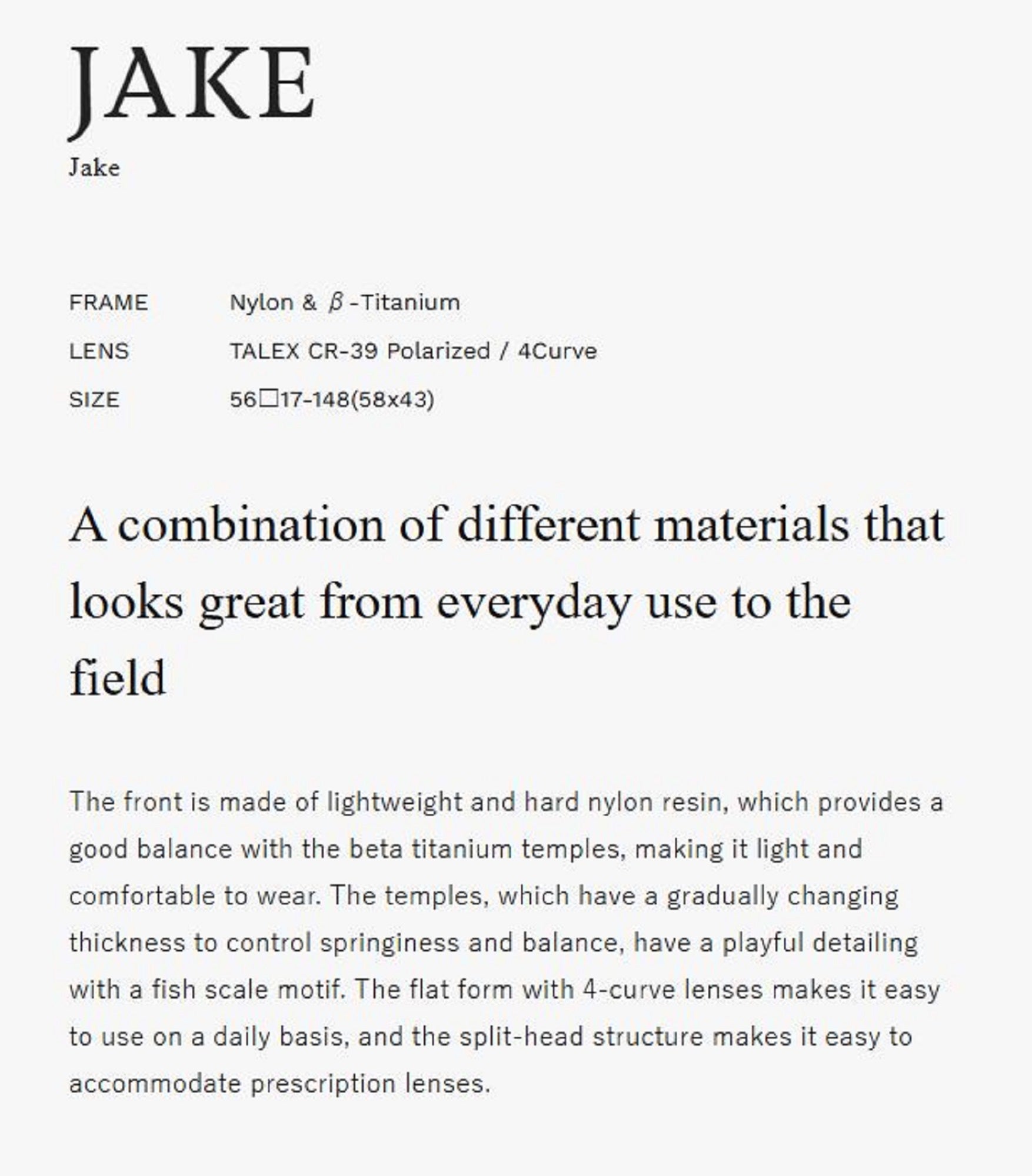 Material: FRAME:Nylon & ?-Titanium, LENS:TALEX CR-39 Polarized / 4Curve